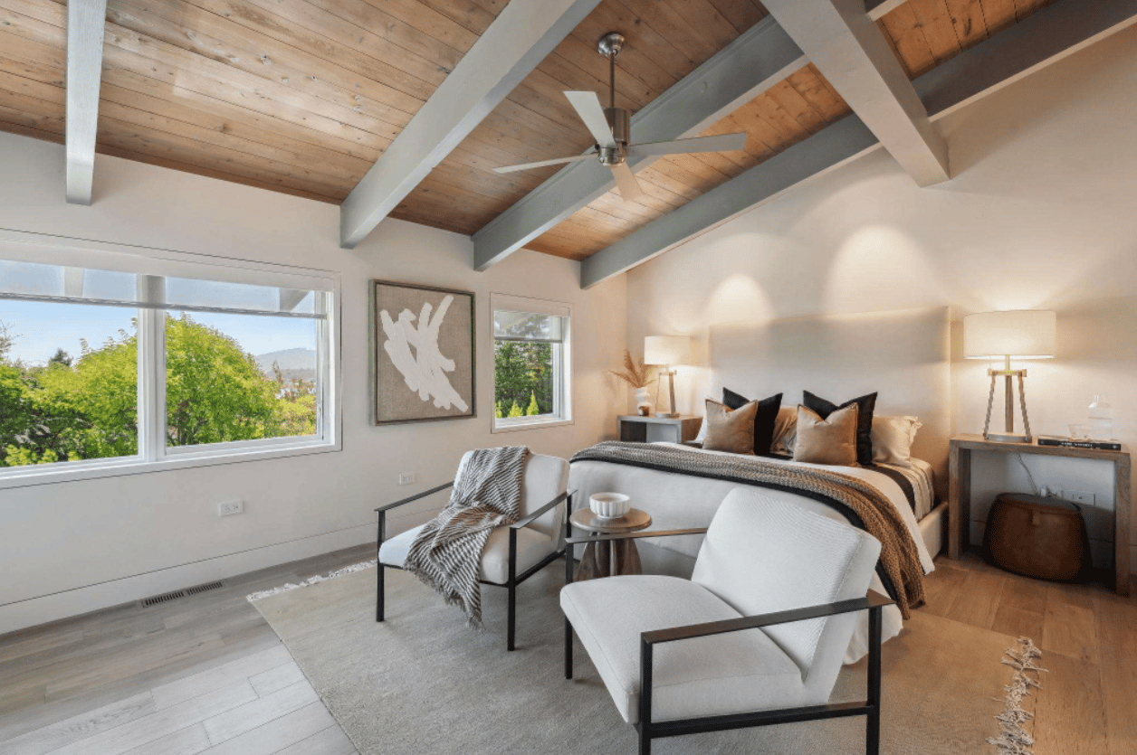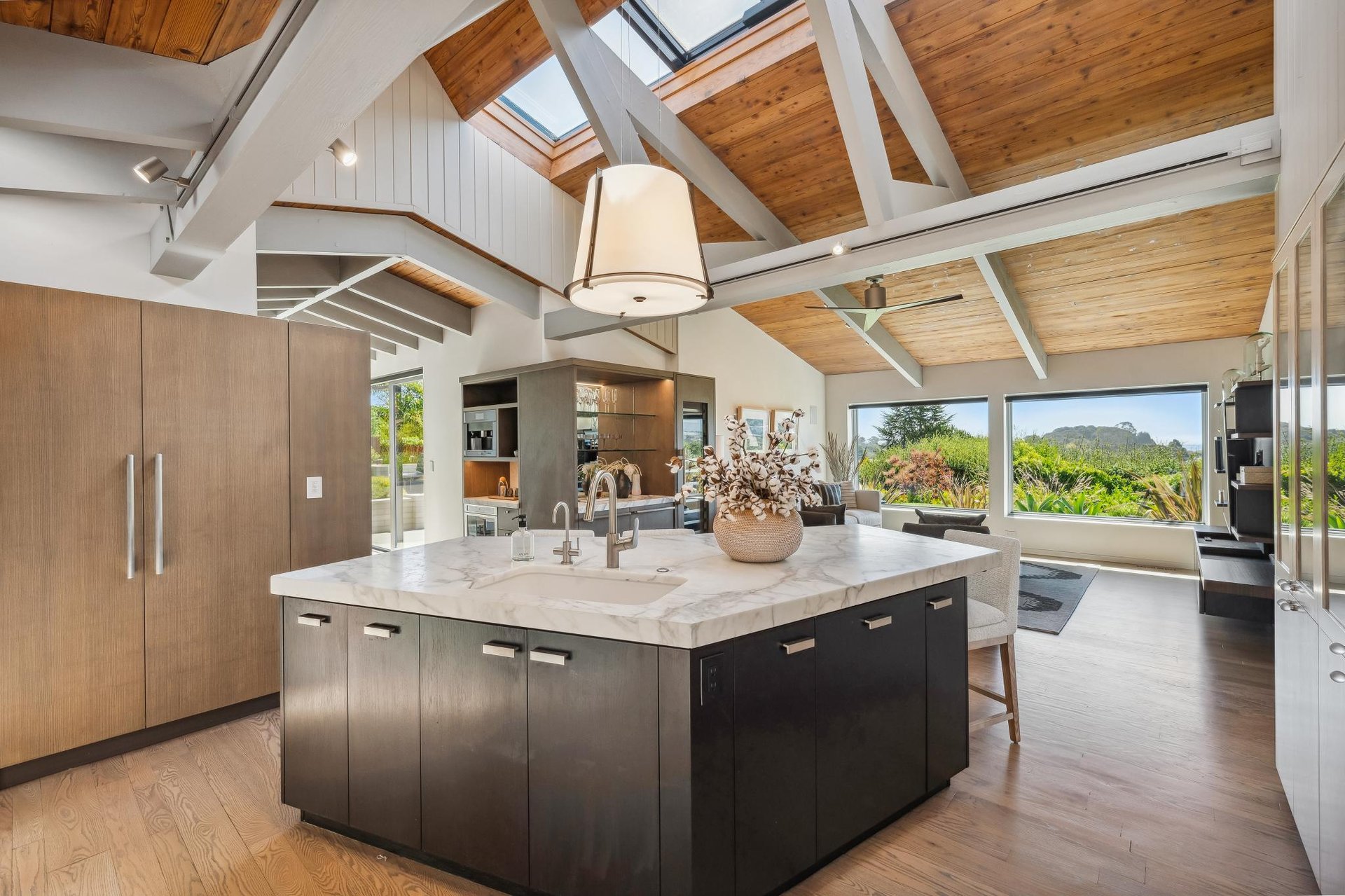 Upon entering you are greeted by a spacious living room with striking open beam vaulted ceilings, complete with stone fireplace and sliding glass doors to one of 2 main patios facing the Bay. To the left of the living room is the gourmet kitchen with custom cabinetry, luxury appliances, wine fridge and built-in Miele coffee machine. At the kitchen’s center you will find a large island adorned with Italian marble, also serving as a breakfast bar, a great spot to take in the views as your family gathers in the adjacent family room as part of this home’s open-concept floor plan. Beyond the kitchen, find a dining area with sliders to a 2nd main patio and outdoor kitchen, and a generous sized laundry room with plenty of storage. To the right of the entrance is a long hallway leading to 3 bedrooms with dramatic cathedral ceilings including the primary suite with walk-in closet and bathroom with double sinks, steam shower and oversized tub. The 4th bedroom located by the pool has a separate entrance and en-suite bathroom and offers multiple uses as a gym, art studio, office, in-law suite or accommodation for an au pair. The meticulously landscaped exterior includes a stunning resort like pool, gourmet outdoor kitchen and plenty of level yard, all perfect for entertaining and hosting special time together with family and friends.