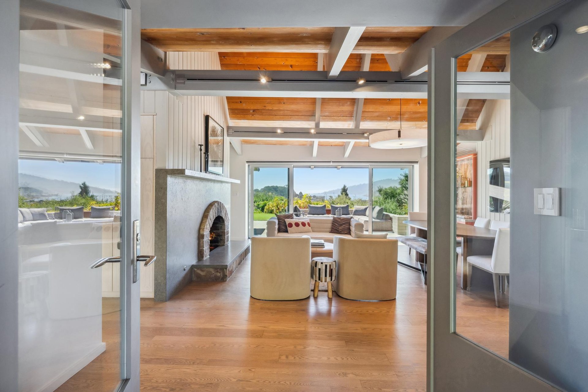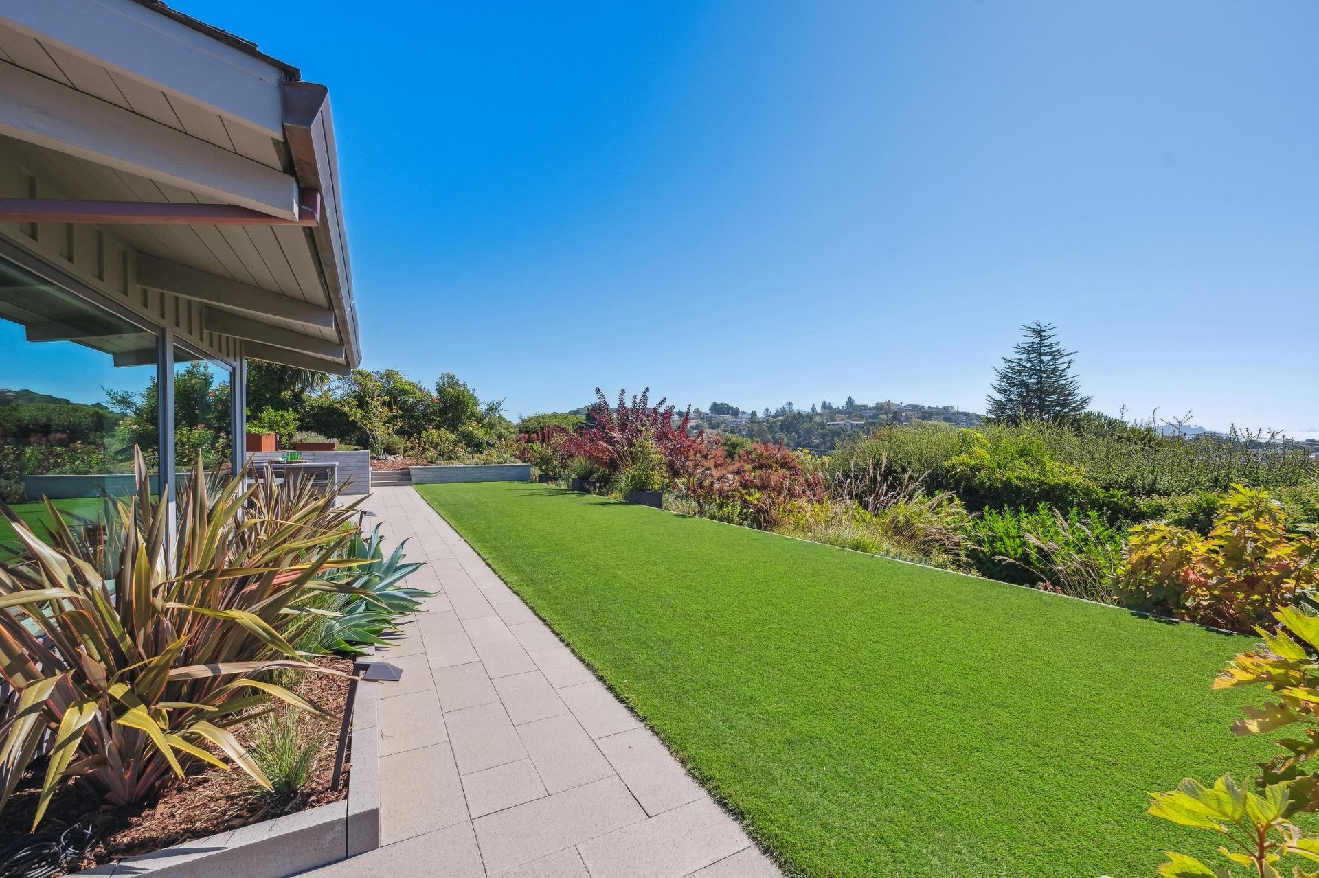 This exceptional turnkey mid-century home is located at the end of a private cul-de-sac with estate-like grounds on close to ½ an acre of level land, and features a charming and unique circular motor court, mature plantings and manicured landscaping. This mostly one-level 4BD, 3BA home has seamless flow with gorgeous views of San Francisco and the Bay from nearly every room.