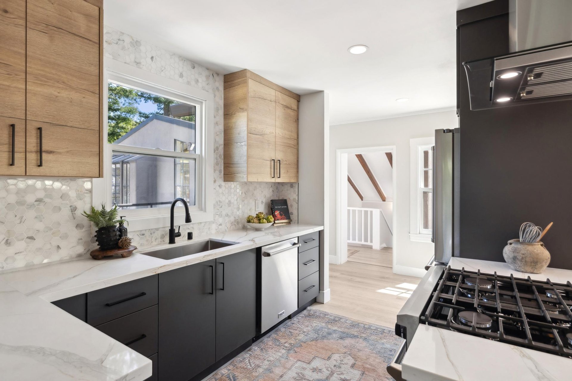 Upstairs, the remodeled kitchen opens to the dining and living areas, as well as a private deck with Mount Tamalpais views. The primary suite is a true retreat, set in its own wing with vaulted ceilings.