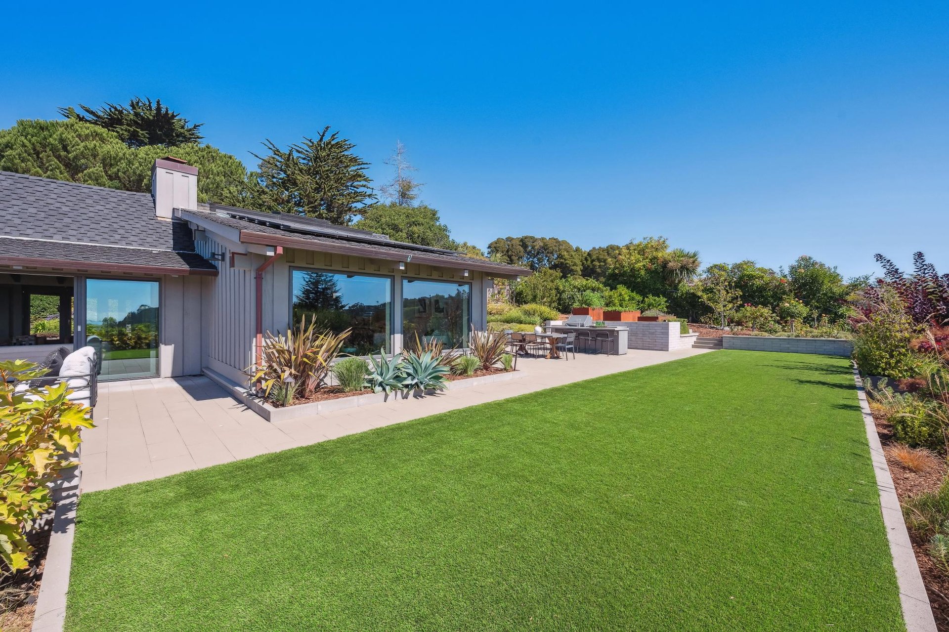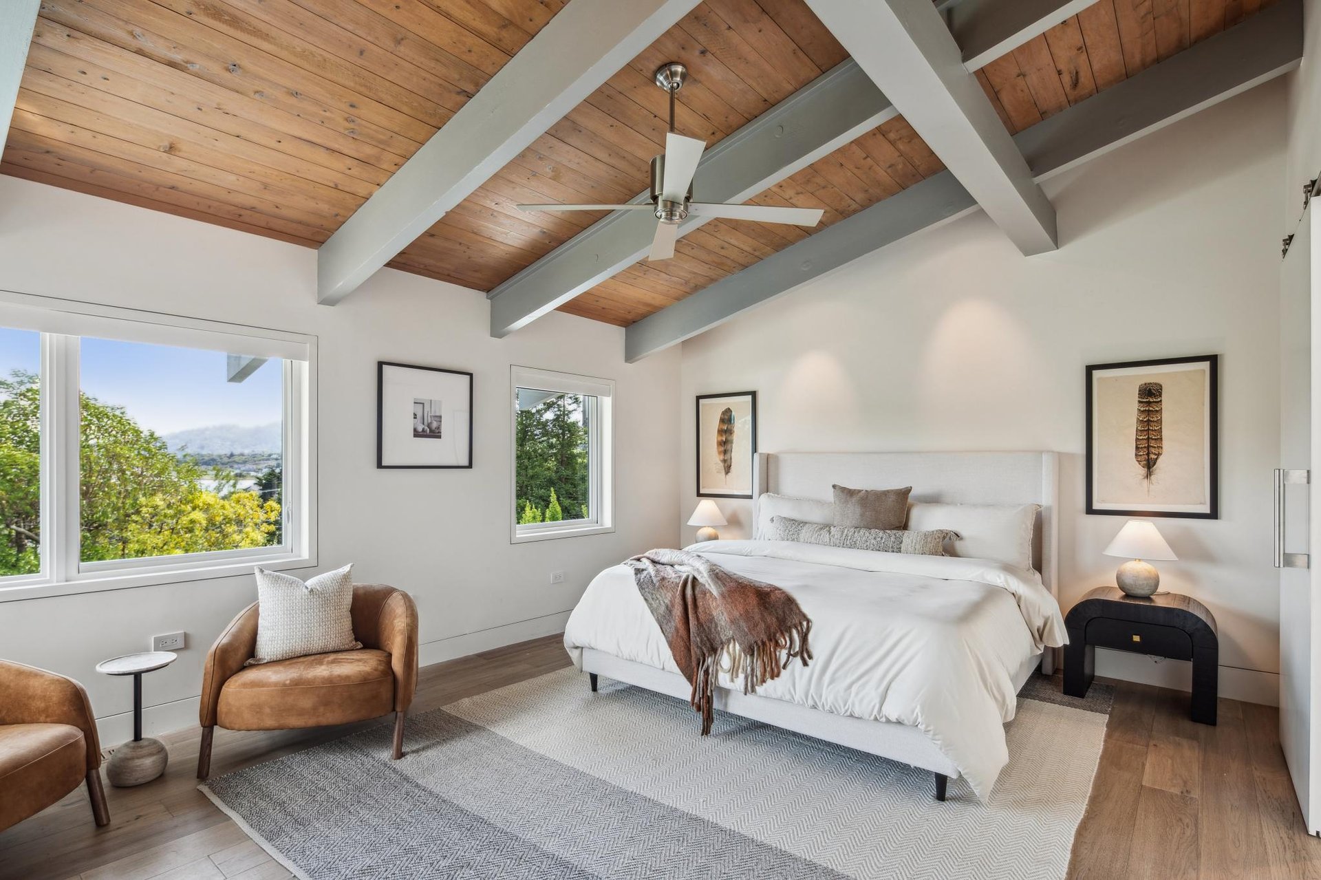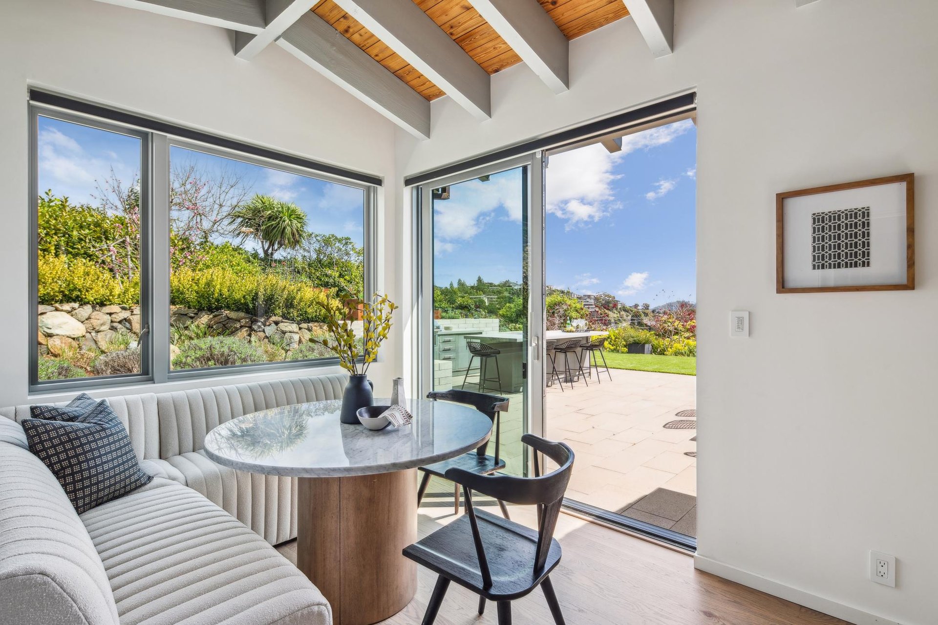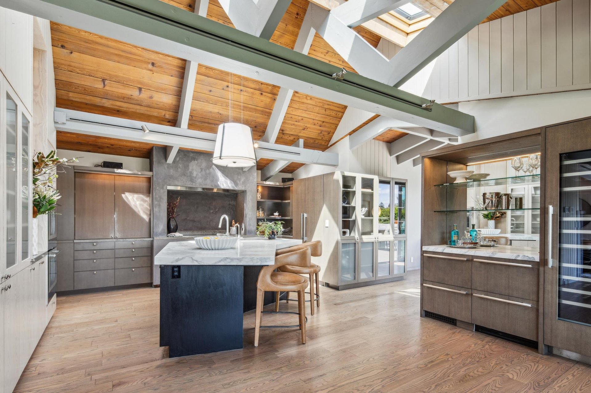 Upon entering you are greeted by a spacious living room with striking open beam vaulted ceilings, complete with stone fireplace and sliding glass doors to one of 2 main patios facing the Bay. To the left of the living room is the gourmet kitchen with custom cabinetry, luxury appliances, wine fridge and built-in Miele coffee machine. At the kitchen’s center you will find a large island adorned with Italian marble, also serving as a breakfast bar, a great spot to take in the views as your family gathers in the adjacent family room as part of this home’s open-concept floor plan. Beyond the kitchen, find a dining area with sliders to a 2nd main patio and outdoor kitchen, and a generous sized laundry room with plenty of storage. To the right of the entrance is a long hallway leading to 3 bedrooms with dramatic cathedral ceilings including the primary suite with walk-in closet and bathroom with double sinks, steam shower and oversized tub. The 4th bedroom located by the pool has a separate entrance and en-suite bathroom and offers multiple uses as a gym, art studio, office, in-law suite or accommodation for an au pair. The meticulously landscaped exterior includes a stunning resort like pool, gourmet outdoor kitchen and plenty of level yard, all perfect for entertaining and hosting special time together with family and friends.
